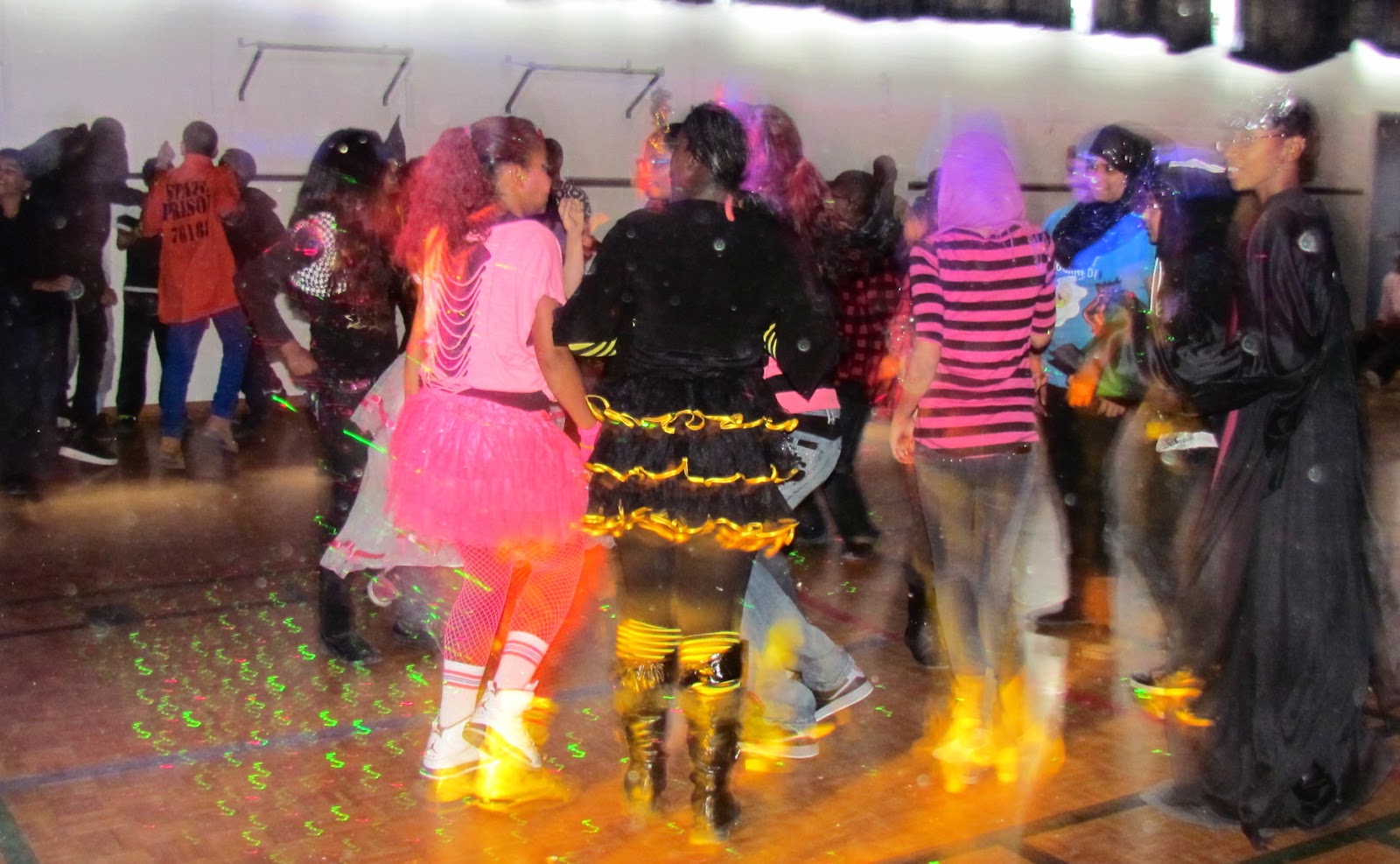 It was a long day and I don't know if I am ever going to be the same again. The music was so loud that I had to stay in the kitchen most of the time. And if I ever hear M J's "Thriller" again I think I am going to scream! It was played for every group that came down to the gym during the entire day. But the kids were terrific! Only one drink spilled and a few popcorn puffs fell on the floor. They all came in costumes and danced their little hearts out. Here are some of the older students, my DD's grade 7/8 class.